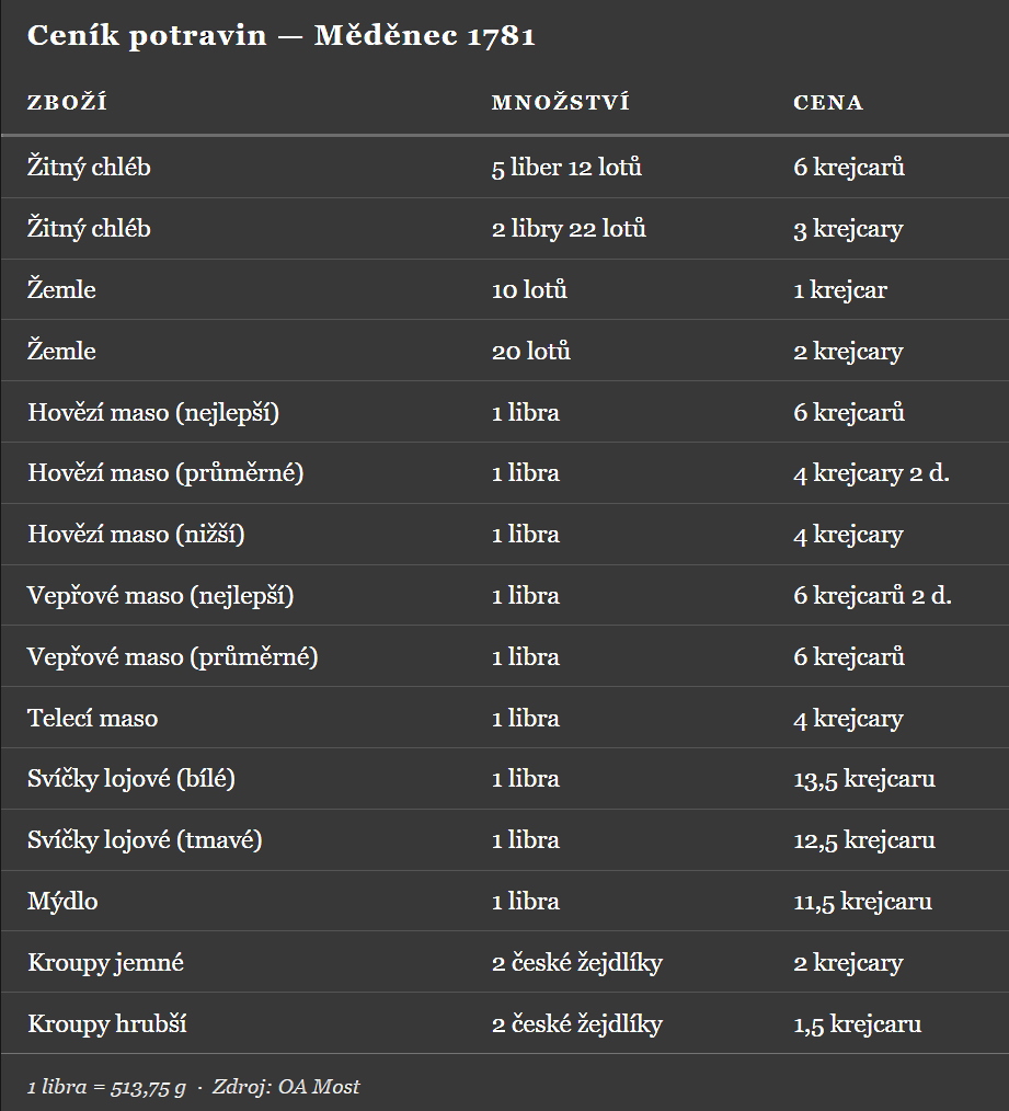 O spotřebě potravin v městech a městečkách českého Krušnohoří nemá naše historiografie dosud žádnou konkrétní představu. Jedinou prací, jež se spotřební problematikou v Krušnohoří zabývala, je studie Joachima Vettera přinášející údaje hlavně o saské části Krušnohoří v 1. polovině 16. století. Autor v souvislosti se zkoumáním reálných mezd hornického obyvatelstva shromáždil údaje o cenách zboží důležitého pro život horníků a dospěl k závěru, že nejdůležitější potravinou byl chléb. Pro oblast Měděnce se takový ceník nezachoval — pouze pro rok 1781 je v Okresním archivu Most uložen ceník nejdůležitějších zdejších potravin: