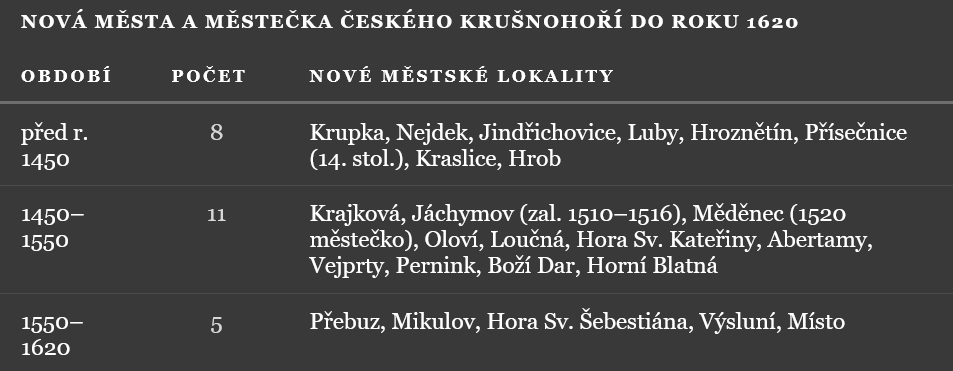 V rozmezí pouhých 35 let (1515–1550) vzniklo na české části Krušných hor v rychlém sledu deset měst a městeček, mezi nimi i nejdůležitější hornické město té doby — Jáchymov. To je přesvědčivý důkaz, že toto období tvoří vrchol urbanizačního procesu v českém Krušnohoří předbělohorské doby.